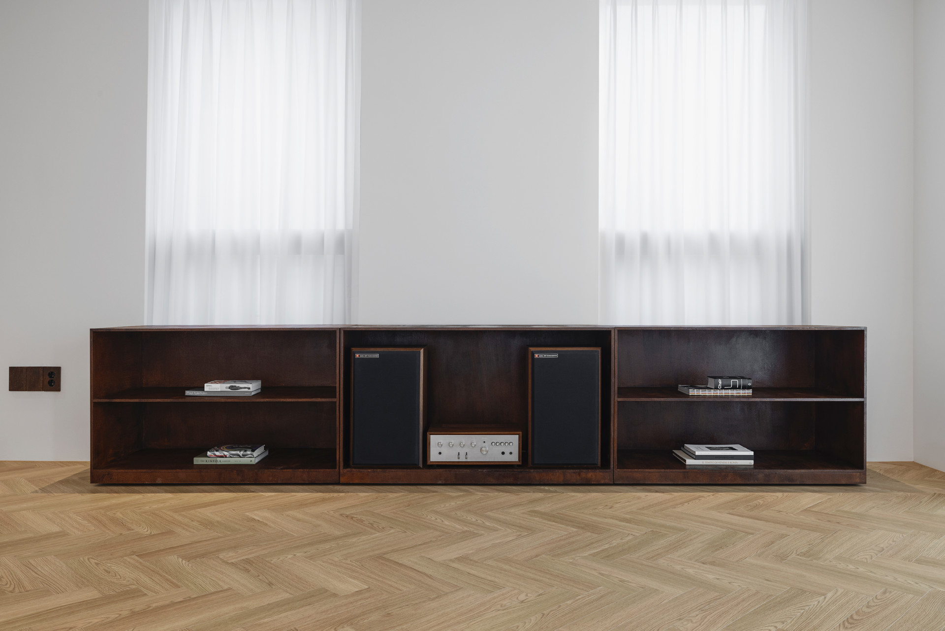 The structure, made of hot-rolled black steel, was deliberately corroded to reveal tonal irregularities and reactive surfaces. LED lights were integrated with transparent wiring and fixed using ordinary metal office clips, intentionally exposing utilitarian details within a refined silhouette—an expression of both historical ornamentation and contemporary structural honesty.