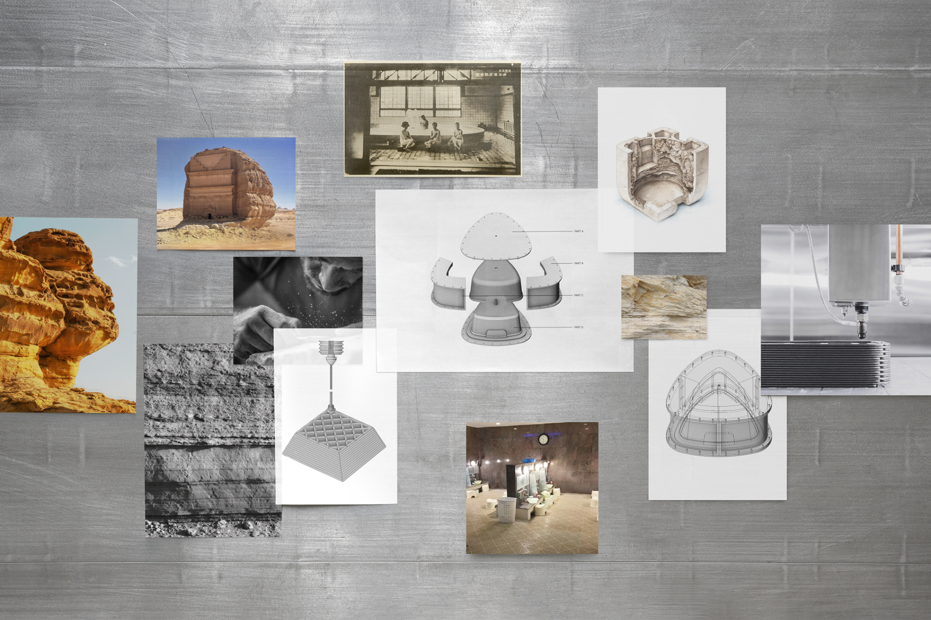 Inspired by the sandstone cliffs and rock-carved heritage of the AlUla region. Although the original designer is unknown, the piece draws from the stable, stackable form of the Korean bathhouse stool, translating geological strata into a sculptural language.
